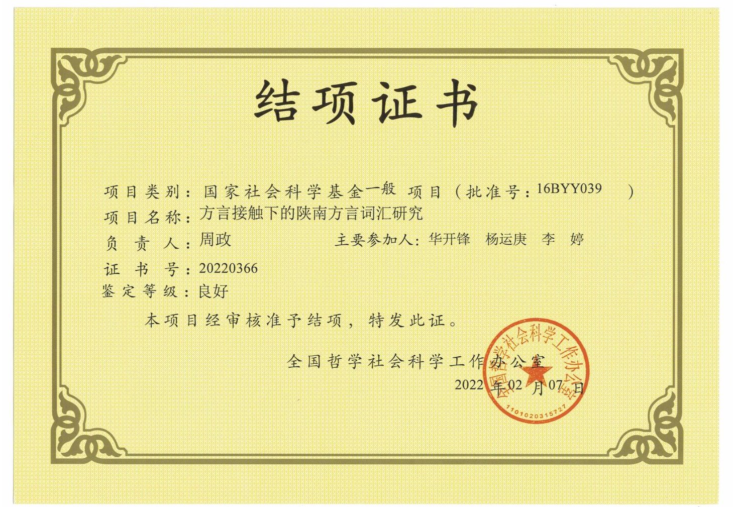导航痕迹 首页 > 师资队伍 > 教师风采 > 正文 师资概况 教师简介 兼职教授 教师风采 李春平专栏 国家社科基金项目——方言接触下的陕南方言词汇研究顺利结题 发布人:文传学院 发布日期:2022年06月07日 阅读次数: