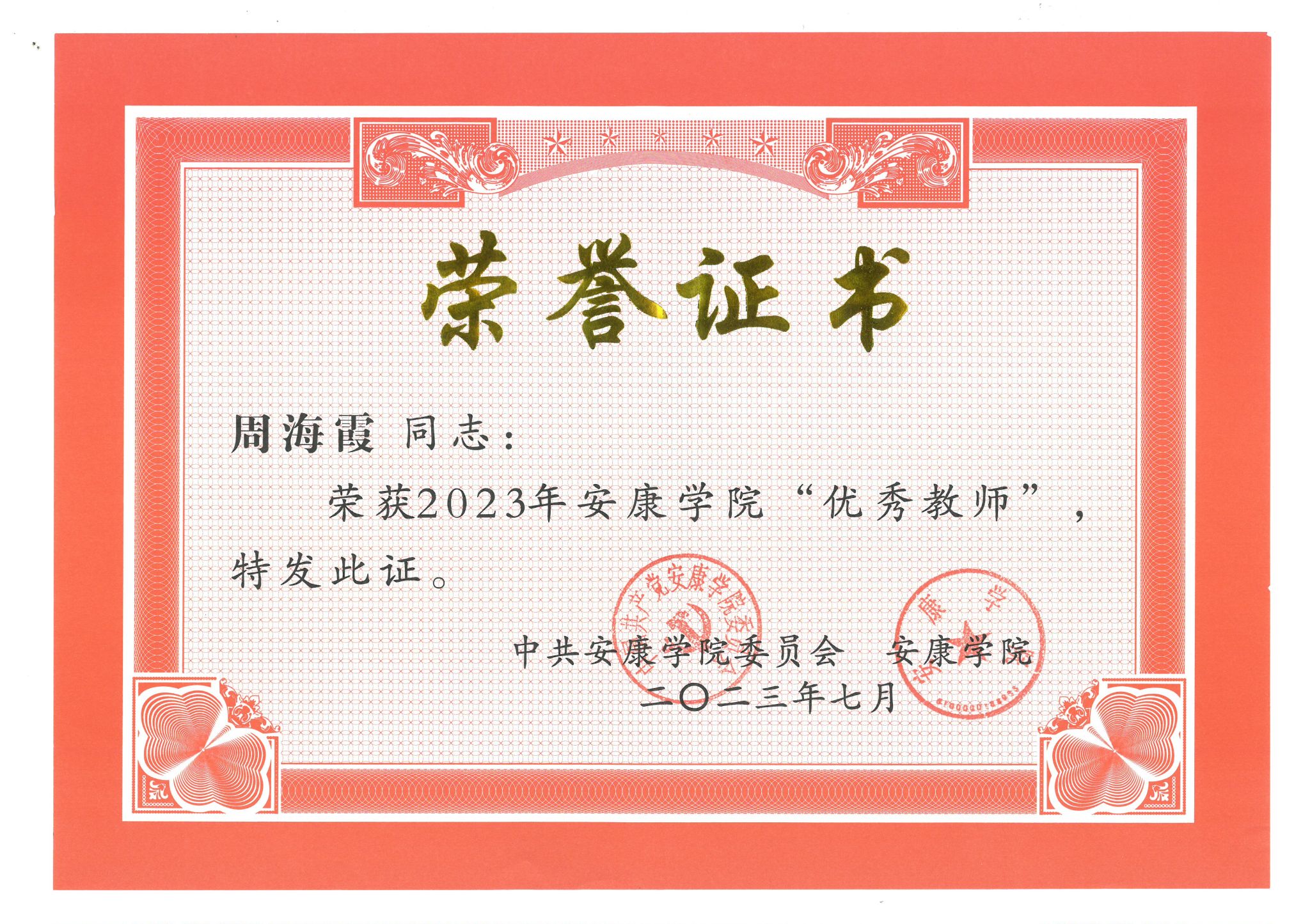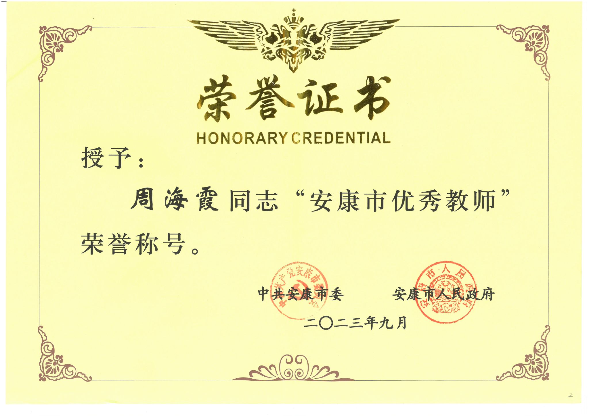 根据《关于推荐评选安康市教育工作先进集体和优秀教师、师德标兵、优秀班主任、先进教育工作者的通知》(安评组办发〔2023〕5号)精神和《今年会官网关于开展2023年校级教职工荣誉评选工作的通知》(党政办发〔2023〕16 号)相关要求,经个人申报、学校组织专家评审,今年会官网教师周海霞被评为今年会官网优秀教师,同时被推荐参评安康市优秀教师,经安康市评审,确定周海霞为2023年安康市优秀教师。