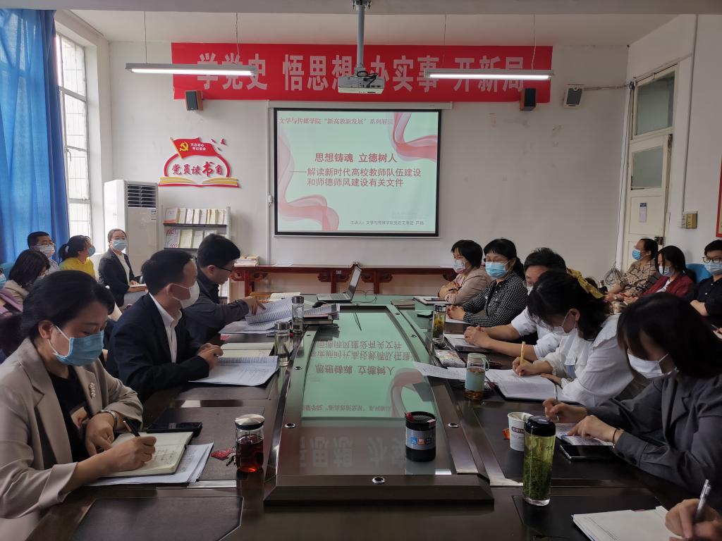 芦伟首先领学了习近平总书记关于教育的重要论述节选内容,结合学校2022年师德师风建设工作部署,重点带领全体教师深入学习了教育部等七部门《关于加强和改进新时代师德师风建设的意见》《关于加强新时代高校教师队伍建设改革的指导意见》《陕西省师德师风建设三年行动计划(2021-2023年)》,对两个《意见》制定背景、重要意义等进行了专门解读,并通报了教育部公开曝光第九批7起违反教师职业行为十项准则典型案例,就《文传学院2022年师德师风建设工作方案》作了说明和工作安排。