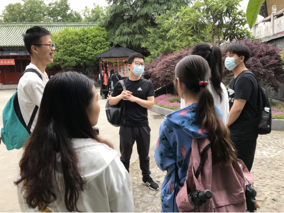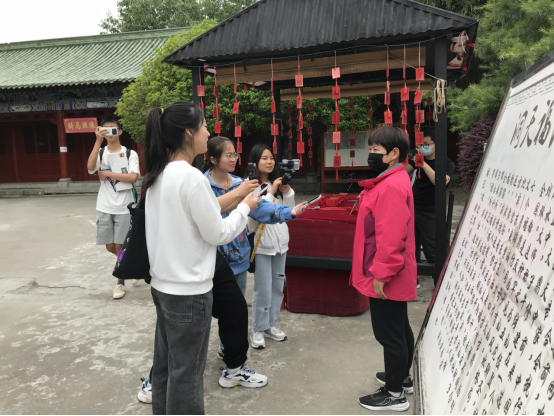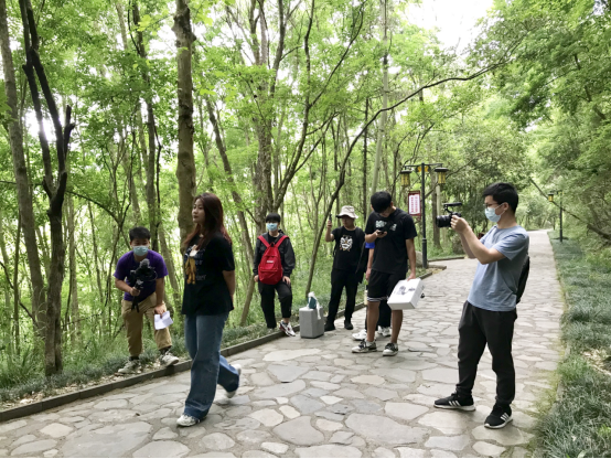 采风活动期间,8组学生在香溪洞风景区内有计划地在老师指导下进行创作。初入景区时,同学们还有一丝拘谨,面对竹木蔽山、花草遍地的自然风光,这丝拘谨很快被打破,大家相互配合,各自展开拍摄活动。有的用镜头捕捉自然倩影,有的在与景区工作人员交流中寻找新闻点,还有的拿出提前备好的道具圆一个古风剧场的梦……山涧鸟鸣、翠屏相列的风光不断激发同学们的创作灵感。采访声、讨论声、欢笑声回荡山间,为幽静的景区增添了些许活力;鲜红的院旗、彩色的衣服、各样的设备,为满目翠绿的景区增添了不少颜色;新闻、视频、短剧等创作,为静态景区提供了流动的名片。每日采风活动结束时,指导老师会召集各小组开会,总结当日拍摄情况和问题,并做出详细解答和指导。