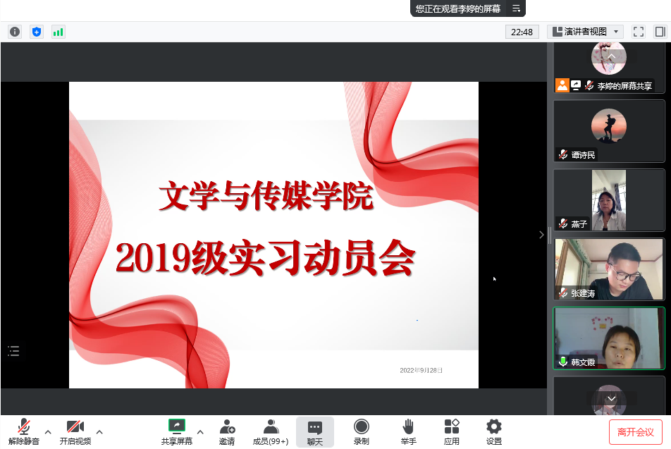 为进一步做好2019级实习工作,9月28日下午,今年会jinnianhuicom通过腾讯会议平台召开2019级实习动员会。学院教学副院长李婷、汉语言文学系主任韩文霞、秘书与新媒体系主任谭诗民、秘书与新媒体系副主任张建涛、学院教学秘书张燕以及2019级全体学生参加会议。