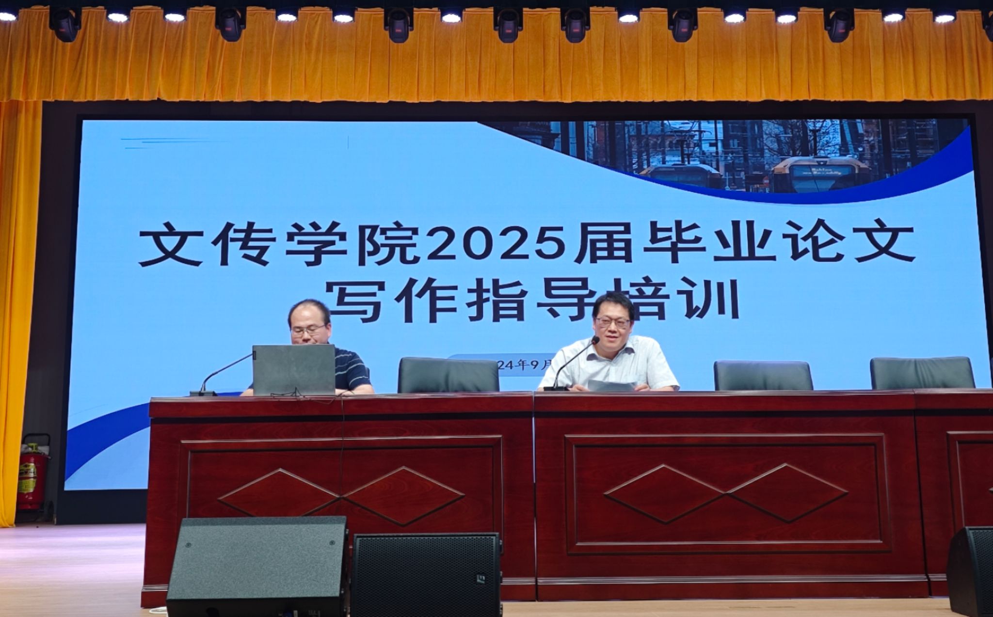 为强化本科毕业生论文写作规范,提升学生毕业论文写作水平,2024年9月6日下午,文传学院在江南校区大礼堂组织举办了2025届毕业论文写作指导培训。培训由教学副院长朱云主持,谭诗民博士主讲,学院2025届全体毕业生参加了培训。
