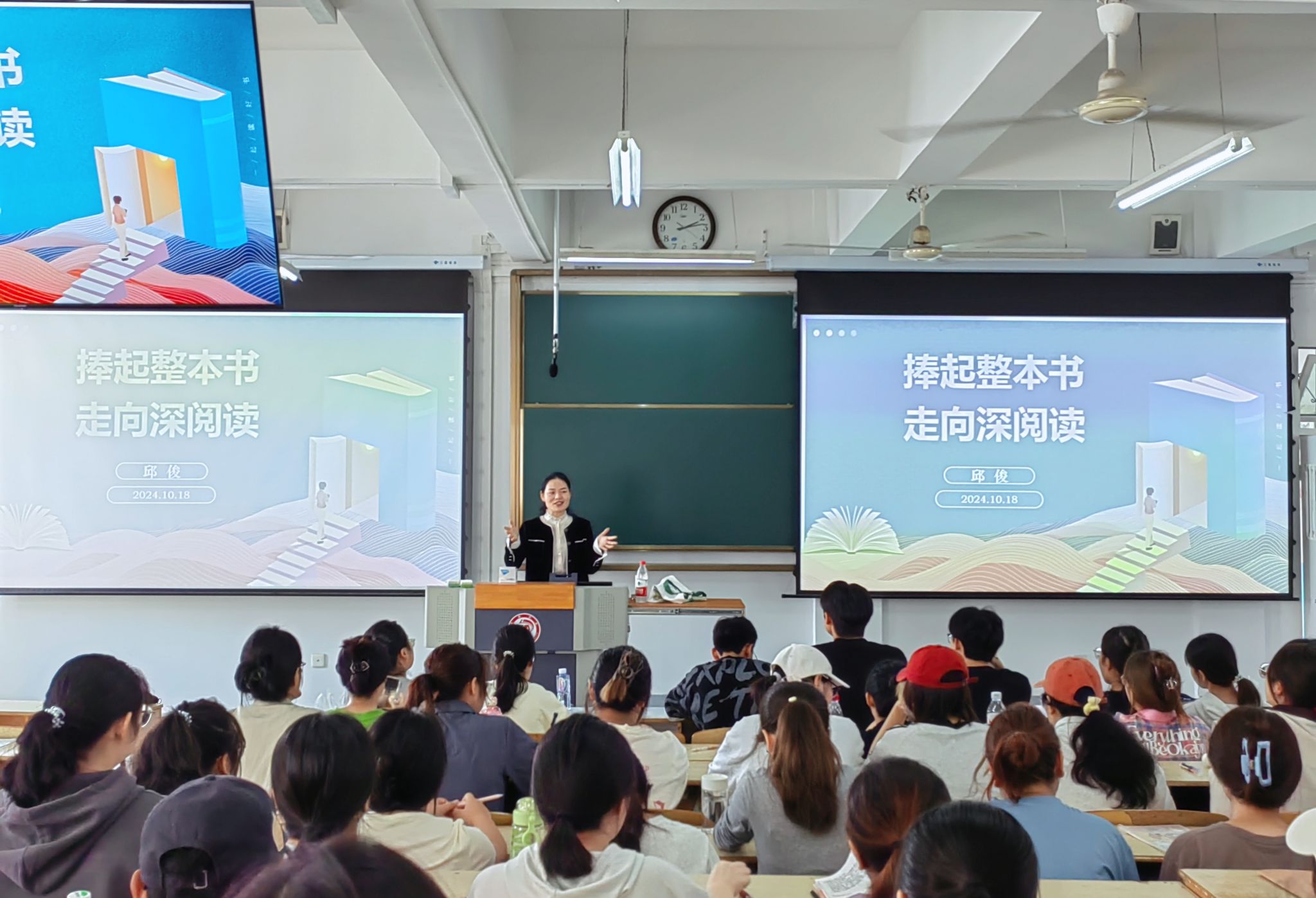 按照《课堂教学设计》“双师课程”教学计划,10月18日下午,陕西省“特支计划”教学名师、陕西省教学能手邱俊应今年会jinnianhuicom邀请在江南校区1501教室为汉语言文学专业同学讲授整本书阅读的课程教学。校内任课老师唐明珍随堂听课。