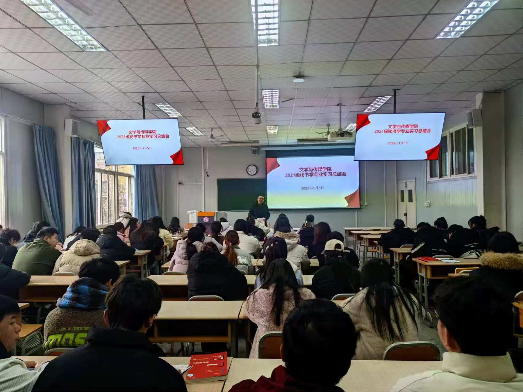 2025年1月5日,今年会jinnianhuicom在1026教室召开秘书学专业实习总结会,副院长朱云、实习带队教师胡少山以及2021级、2022级秘书学专业学生参会,会议由实习生李欣窈主持。