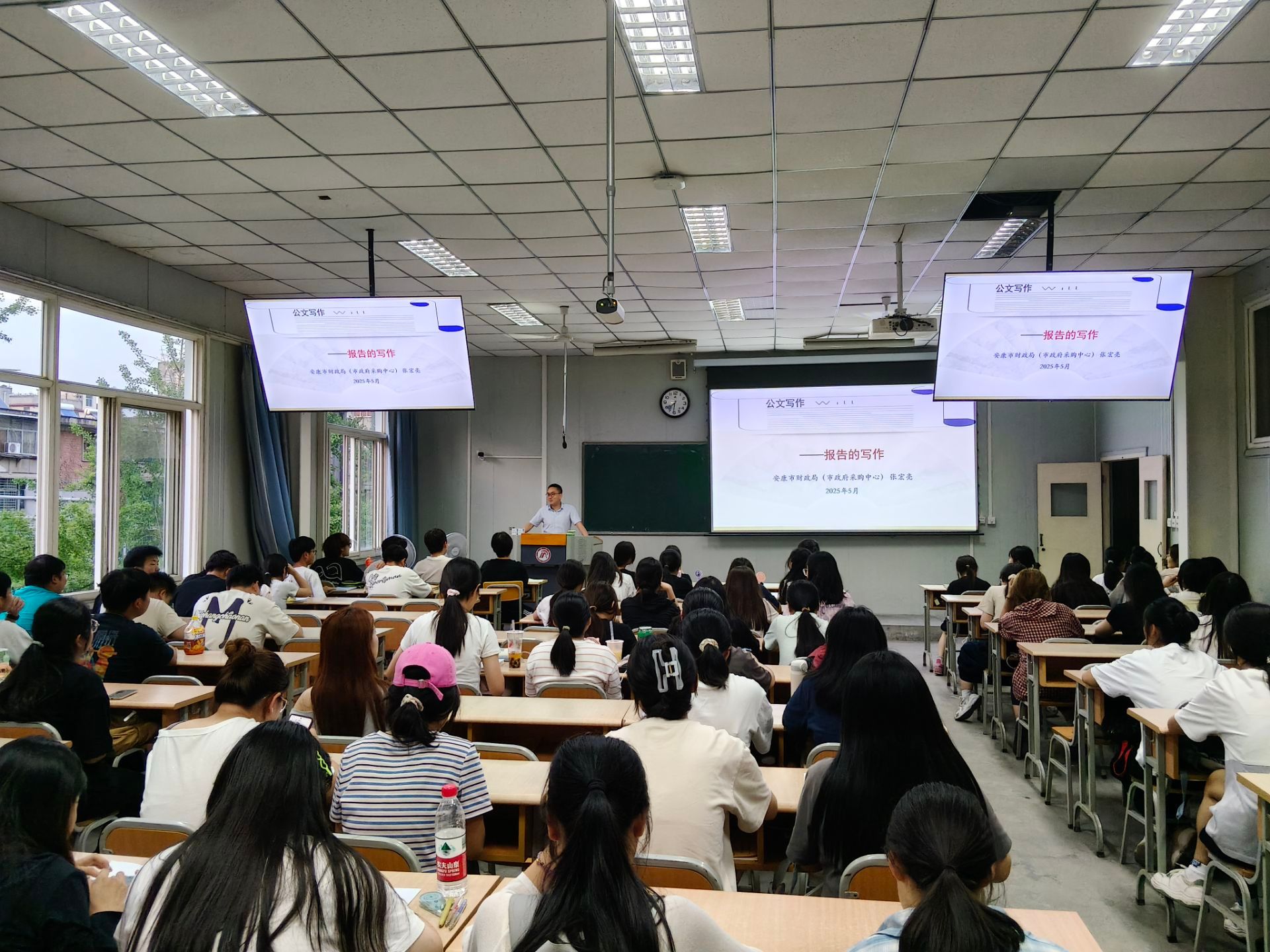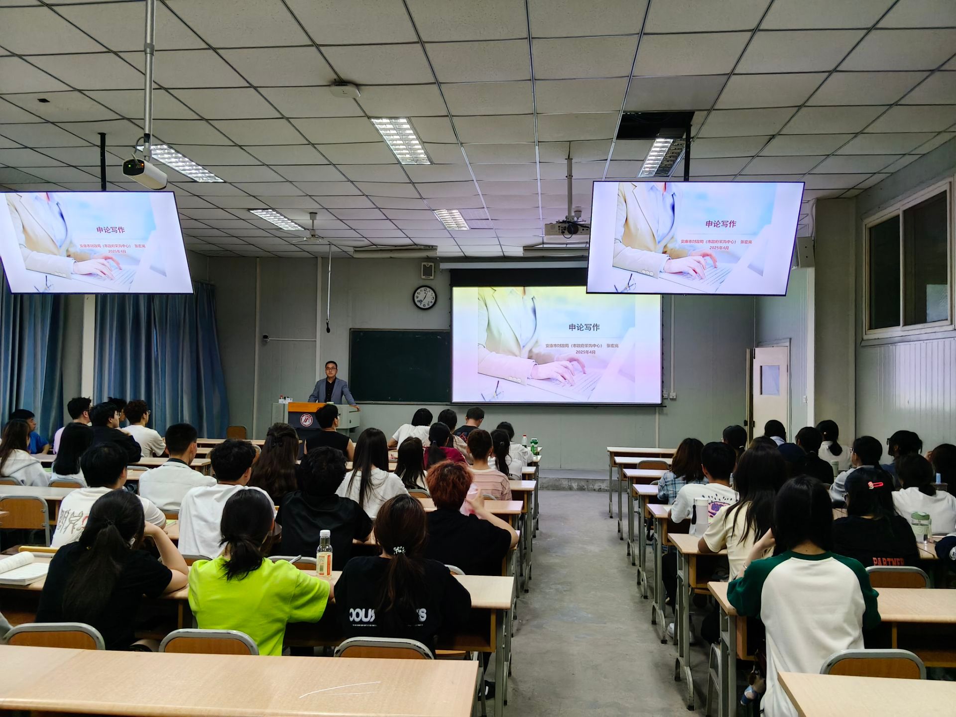 按照《应用文写作》“双师”课程教学计划,今年会jinnianhuicom于4月9日、4月18日、5月20日、6月3日邀请行业专家安康市政府采购中心张宏亮为汉语言文学2024级1、2、5班学生分四次讲授请示、批复、报告、函、纪要等公文和申论写作的技巧,校内任课教师胡少山随堂听课。