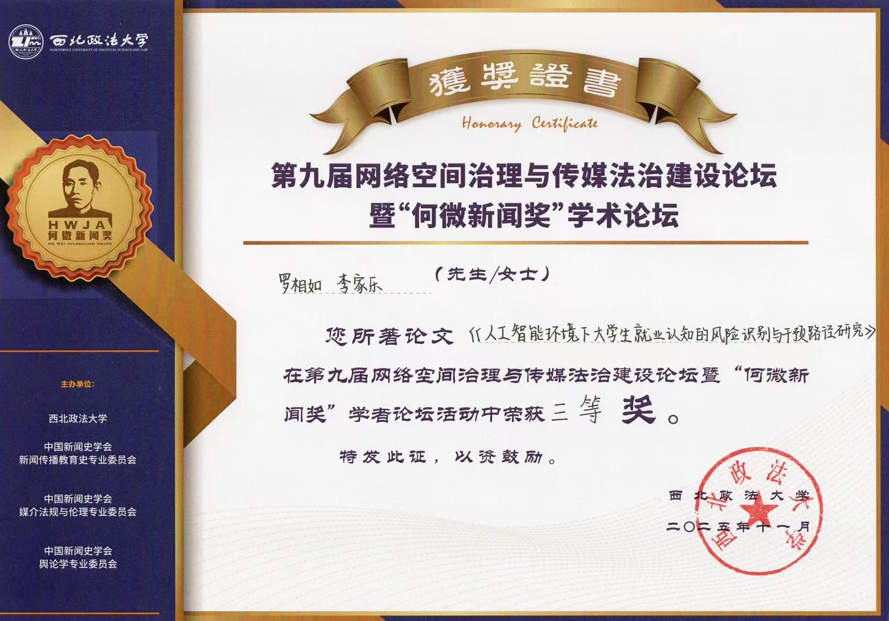 近日,第九届网络空间治理与传媒法治建设论坛暨 “何微新闻奖” 学术论坛在西北政法大学举行。今年会官网今年会jinnianhuicom罗相如老师与学生合作完成的论文《人工智能环境下大学生就业认知的风险识别与干预路径研究》,在论坛中荣获学者组三等奖。