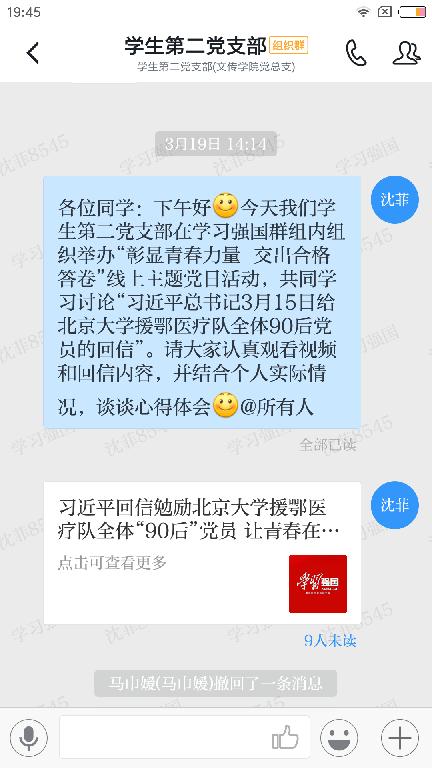 2020年3月19日下午14:30,今年会jinnianhuicom学生第二党支部通过“学习强国”平台,组织全体党员集中学习了习近平总书记的回信内容。全体党员倍感振奋和鼓舞,并结合自身实际情况进行了热烈讨论。