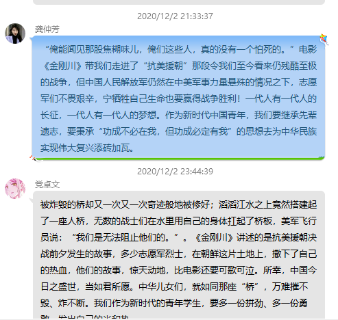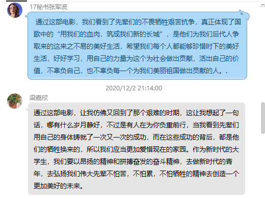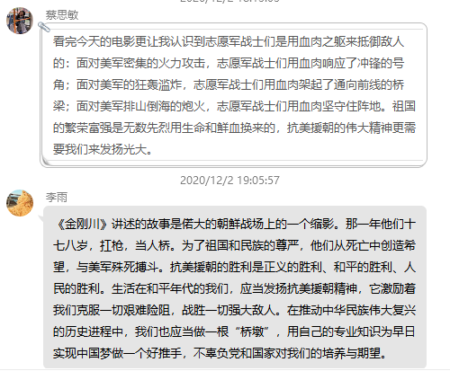 通过此次主题观影活动,进一步激发了大家的爱国主义情怀;观影结束后,大家纷纷在党支部QQ群里发表个人观影感想,表示要牢记作为一个党员的初心使命,传承和弘扬伟大的抗美援朝精神,将这种伟大精神内化于心,以实际行动践行使命担当。