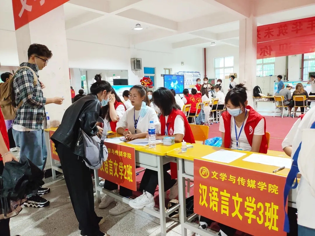 文传学院学生第一、二党支部的志愿者们在十号楼门前的文传迎新点热情相迎,他们引导新生到体育馆报道处办理入学登记、搬运行李、宿舍登记、领日用品、办校园卡等一应入学手续。然后继续来回穿梭于校园,迎接下一位新同学。