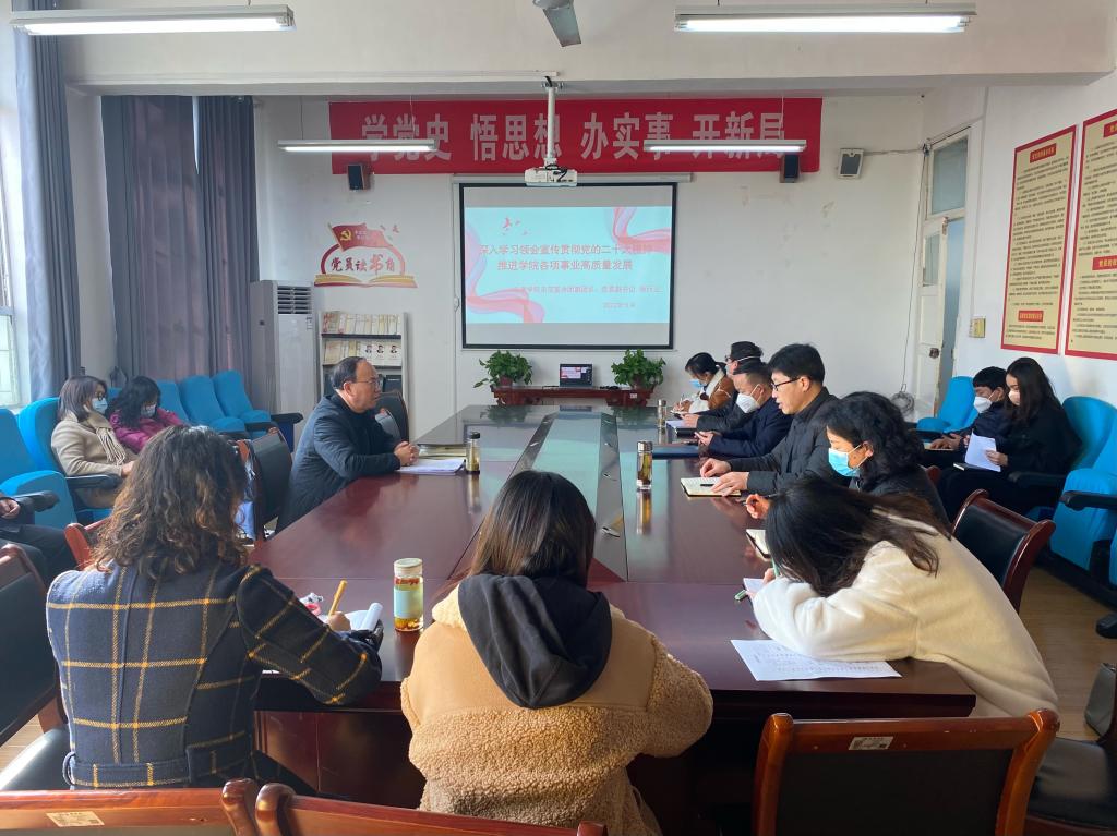杨行玉从大会主要议程、大会主题、主要成果、伟大变革、目标任务、推进学院事业高质量发展等六个方面全面系统地解读了党的二十大精神。他强调,党的十八大以来,习近平总书记每次来陕考察都到学校、都看教育,先后11次对我省教育工作作出重要指示批示,为教育改革发展指明了方向,提出了明确要求。他指出,全体教师要深入学习贯彻党的二十大精神,提高政治站位,积极投入研究,立足学科特点,切实做好“三进”工作,融入课程思政,加强宣传报道,营造全院学习宣传贯彻党的二十大精神的良好氛围,确保学校各项事业坚定沿着习近平总书记指引的方向高质量发展。