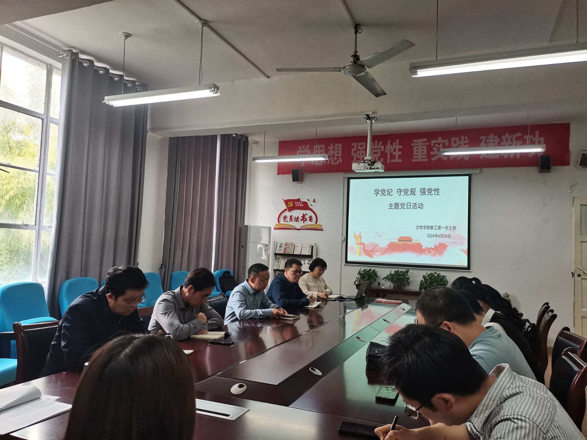 为深入贯彻落实全面从严治党要求,进一步提高党员遵规守纪的自觉性,以党纪学习教育强基固本,推动党员教师的思想自觉和行动自觉,做到内化于心、外化于行,4月24午,文传学院教工第一支部组织全体党员开展“学党纪、守党规、强党性”四月主题党日活动活动在2307会议室举行,由支部书记韩文霞主持。