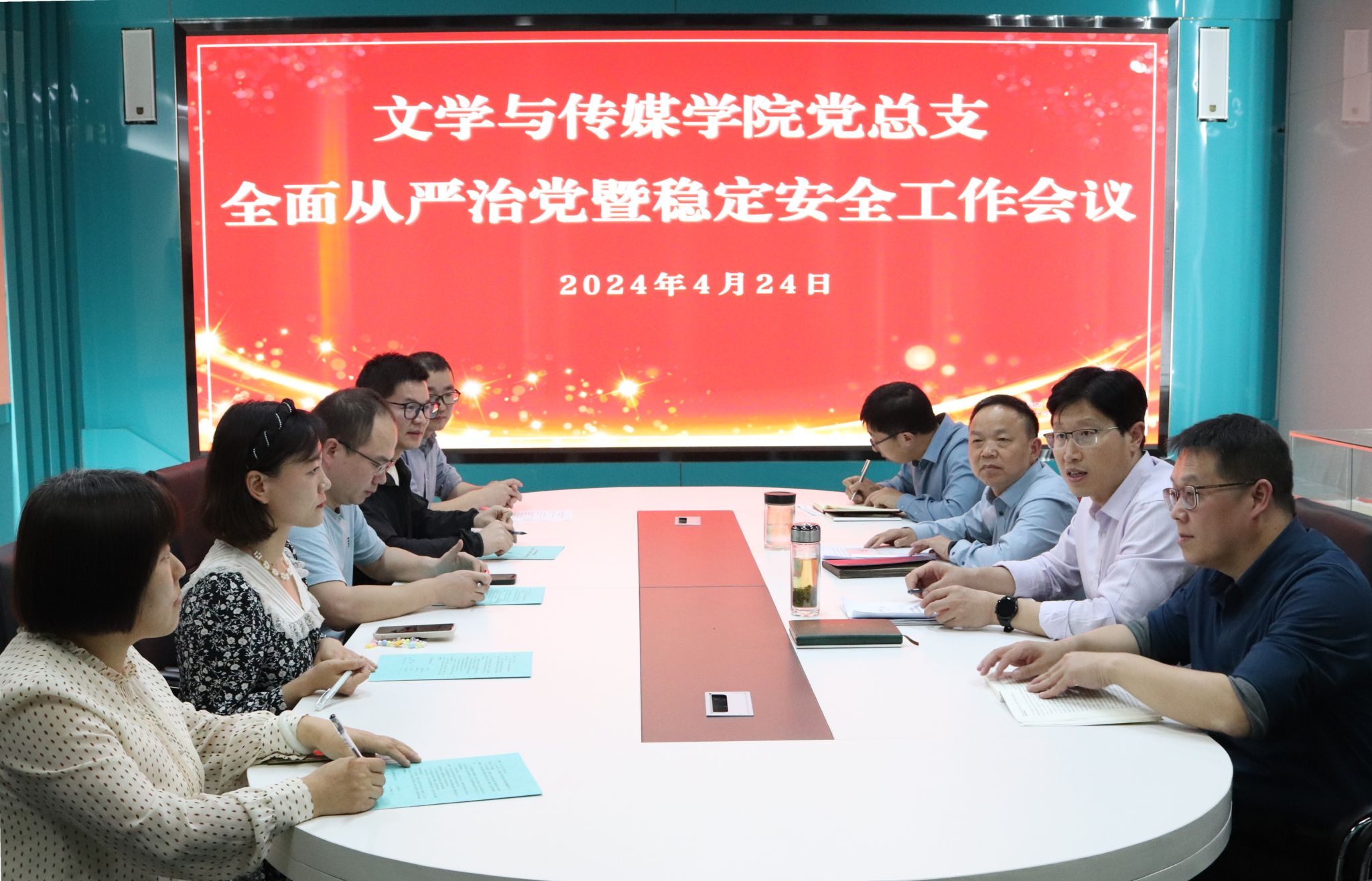 424日,文传学院党总支在多功能室召开全面从严治党暨稳定安全工作会议,学院领导班子成员、党支部书记、系主任、两办主任等参加会议,会议由文传学院党总支书记芦伟主持。