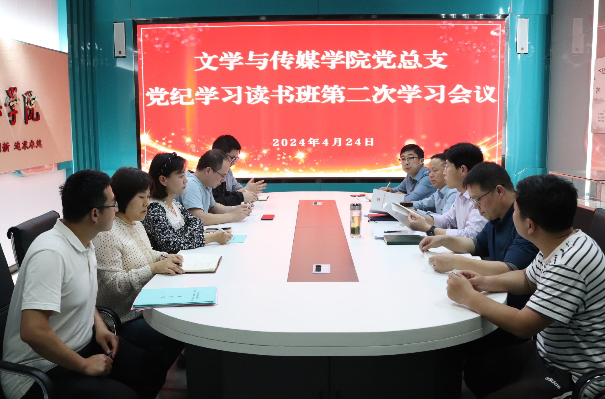4月24日下午,文传学院党总支在多功能室召开党纪学习教育读书班第二次学习会议,文传学院领导班子成员、理论学习中心组成员参加学习会议,会议由党总支书记芦伟主持。