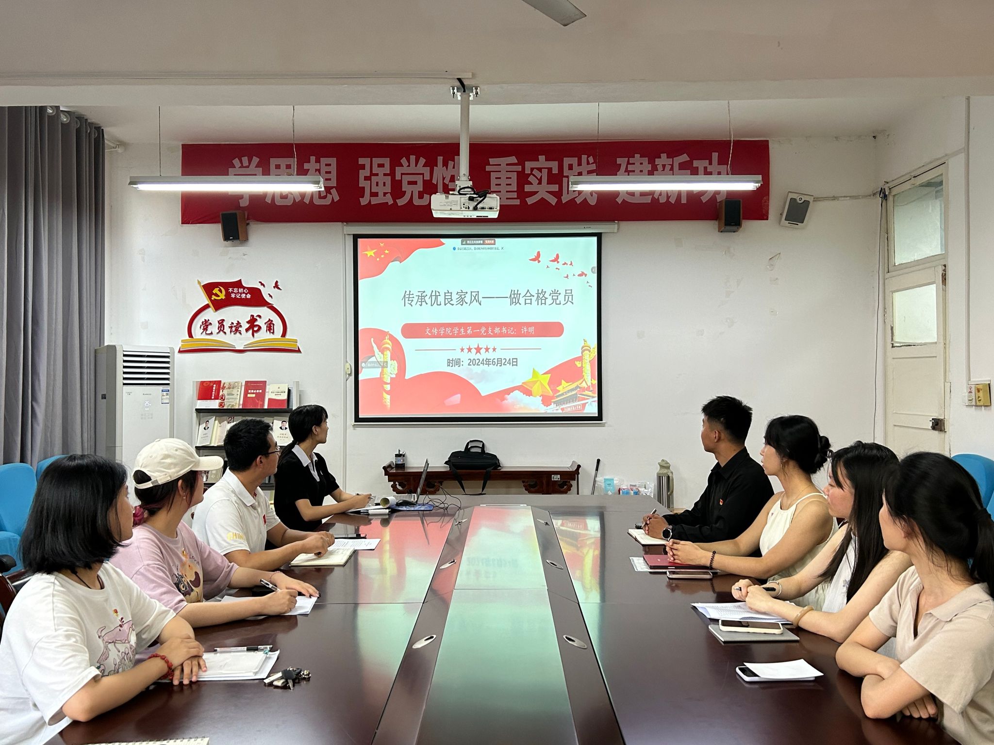 为深入开展党纪学习教育,传承党的优良传统和光荣作风,2024年6月24日下午,文传学院学生第一党支部书记以“传承优良家风家训,做合格党员为主题”为全体党员讲了一堂生动的党课。