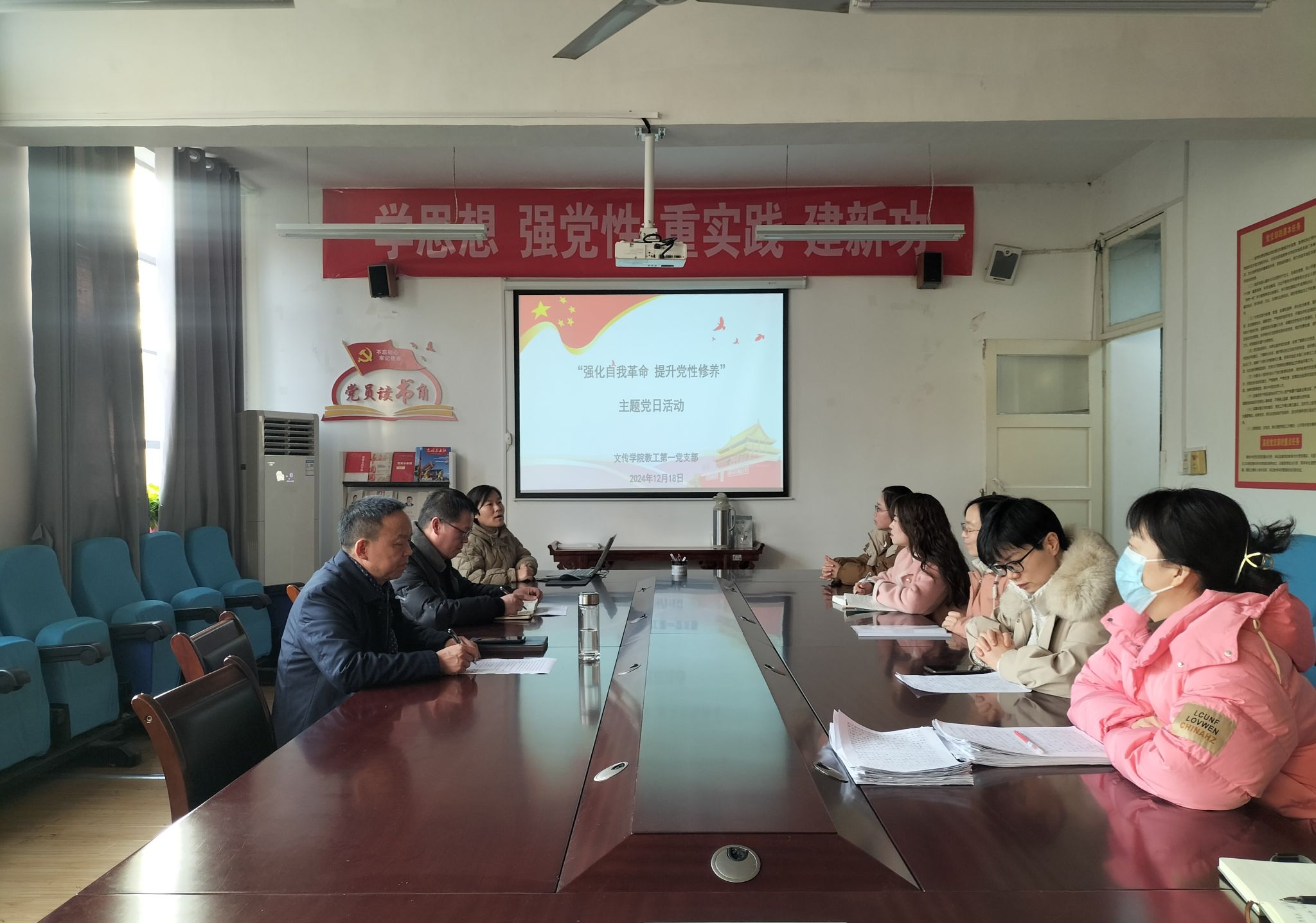 为进一步学习和理解习近平总书记的《深入推进党的自我革命》精神内涵,2024年12月18日下午,文传学院教工第一支部组织全体党员开展“强化自我革命 提升党性修养”主题党日活动,活动由支部书记韩文霞主持。
