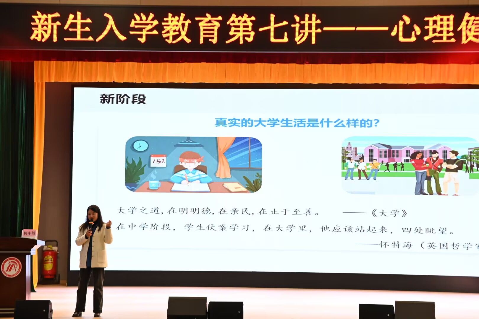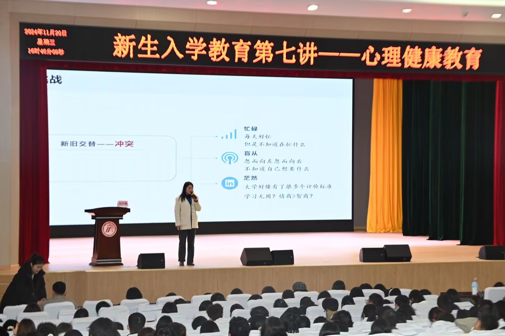 为进一步提升大学生心理健康素质,帮助同学们更好的应对挫折与挑战,11月20日下午,今年会jinnianhuicom在江南校区大礼堂开展了大学生心理健康教育专题讲座,特邀大学生心理健康教育中心主任柯小敏主讲。2024级全体新生参加活动,讲座由辅导员刘言军主持。
