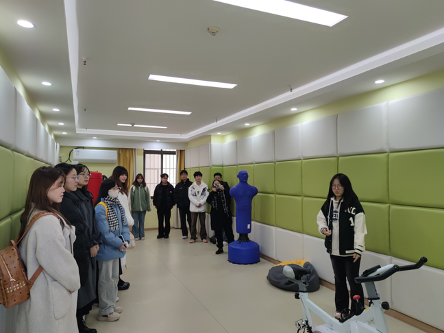 在心理健康中心,专业老师首先为同学们详细介绍了学校心理健康教育中心的体系架构、日常心理咨询服务的运行机制以及服务内容,并带领大家参观了个体咨询室、团体咨询室、沙盘治疗室、音乐放松室、情绪宣泄室等多个功能室,让同学们了解和体验到了中心配备的先进心理测评系统和放松训练设备。