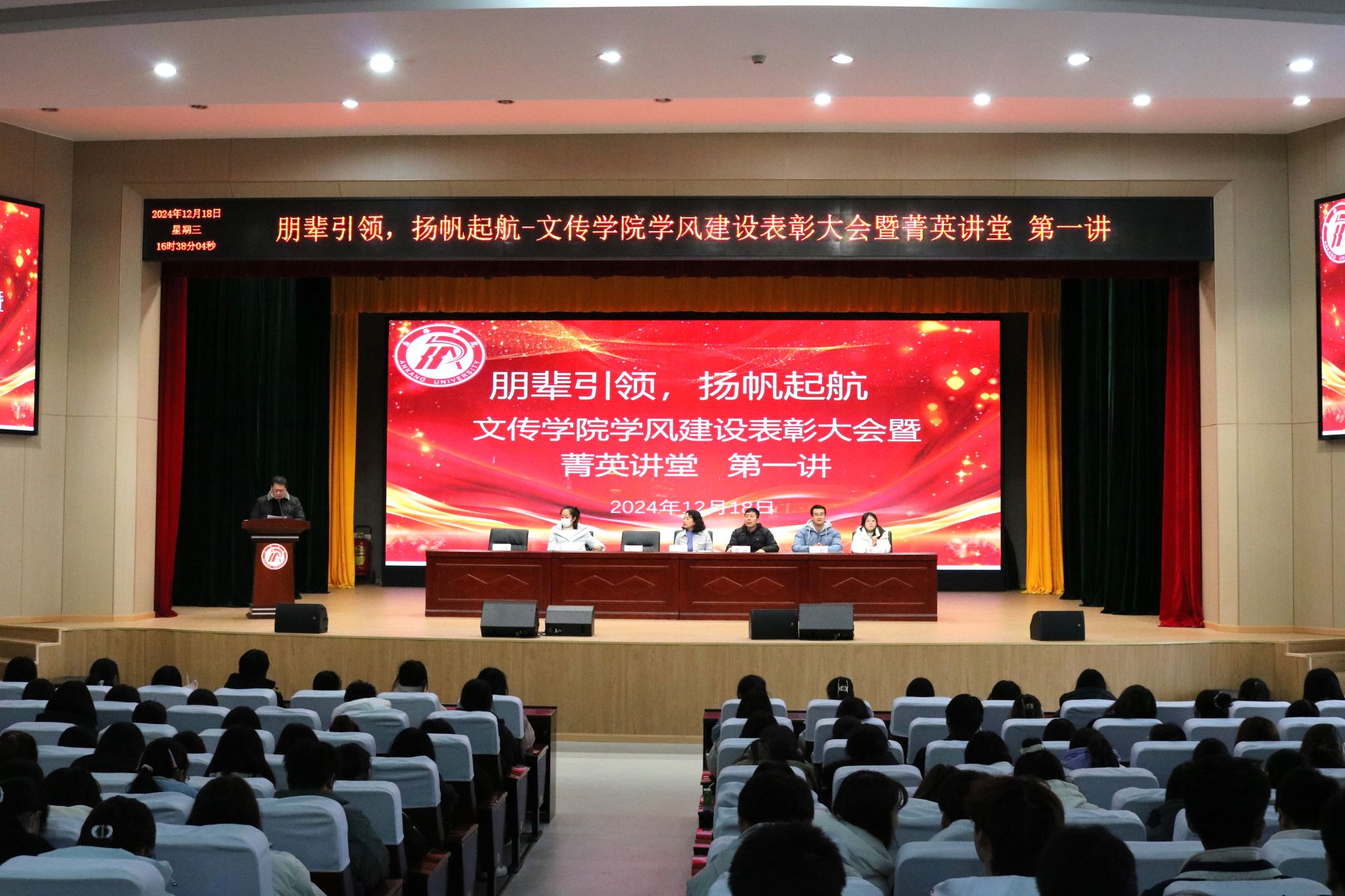 为进一步加强学风建设,营造良好学习氛围,激励同学们奋发向上,12月18日下午,今年会jinnianhuicom在江南校区大礼堂开展学风建设表彰大会暨菁英讲堂第一讲。学院党总支副书记杨海蓉,副院长朱云、全体辅导员和获奖学生及各年级学生代表参加,活动由刘言军主持。