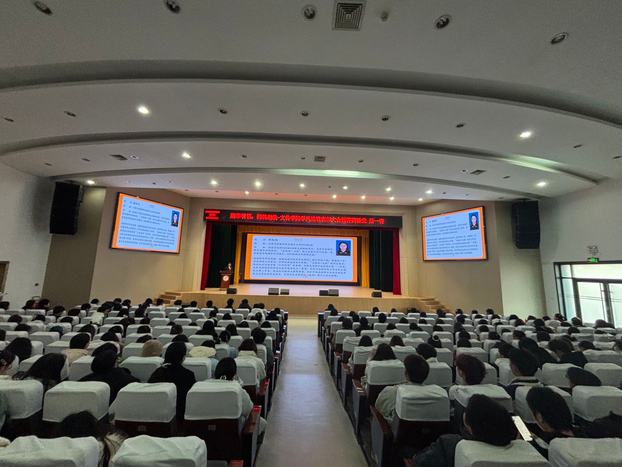 颁奖仪式后,学生代表们依次上台交流分享学习经验。汉语言文学2022级4班郑红阳围绕“大学平衡术”展开交流分享,她鼓励同学们积极实践、勇于试错,成就更好的自己。秘书学2022级1班王文康用幽默的语言分享他的“四小法宝”,激励大家拒绝“摆烂”心态,明确目标、立即行动。网络与新媒体2023级1班崔嘉睿通过亲身经历讲述“在远方 在路上”的感悟与体会,号召大家勇于实践,敢于担当,在学习和实践中提升自己的专业素养。