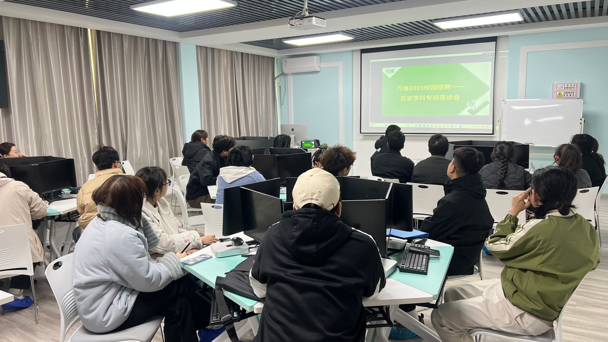 作为全国中考教辅领域的标杆企业,万维集团本次专设历史学科招聘专场吸引学生积极参与宣讲会中企业负责人主要通过公司介绍、岗位介绍、培训与福利和答疑环节这四个方面来向大家介绍,不仅向大家展示优质企业的招聘要求,还为大家剖析了岗位职责与晋升路径现场学生通过大屏幕实时观摩云端宣讲,就职业发展、薪资待遇等问题踊跃提问,现场氛围热烈。
