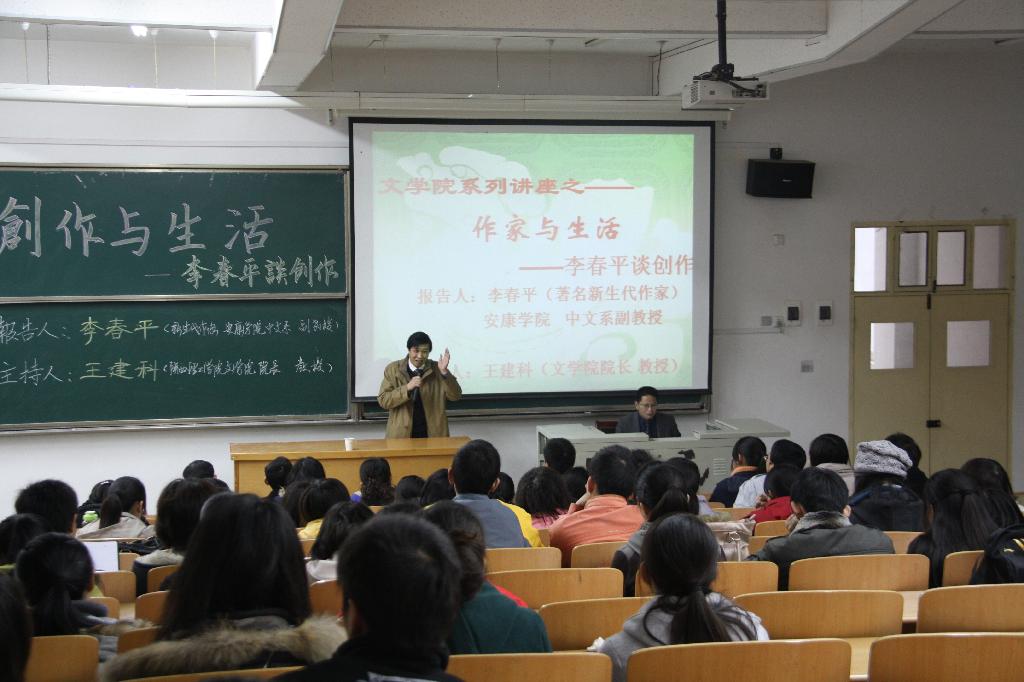 李春平围绕作家与生活这一话题,就生活与文学的关系、作家与作品、读书与写作、虚构与真实的关系作了生动的讲解,并与现场听众进行了互动,回答了同学们提出的有关创作训练与如何做人等问题,博得阵阵掌声。汉中市部分文学爱好者也闻讯前来聆听了报告。