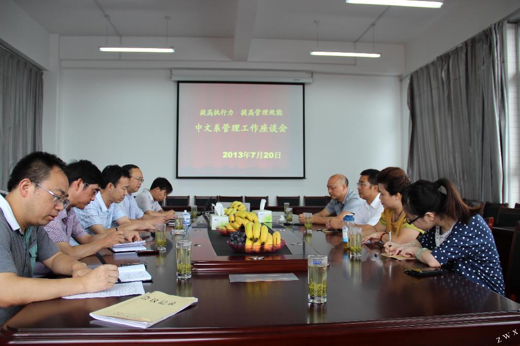 为了进一步提高执行力,提高管理效能,促进第一课堂与第二课堂一体化、促进教学管理与学生管理一体化、促进教学工作与科研工作一体化,中文系于2013年7月20-21日在陕南民间文化研究中心召开了管理工作座谈会,学校纪委书记闵小平、中文系领导班子成员、全体辅导员老师、两办秘书参加了座谈会。座谈会由系主任戴承元主持。