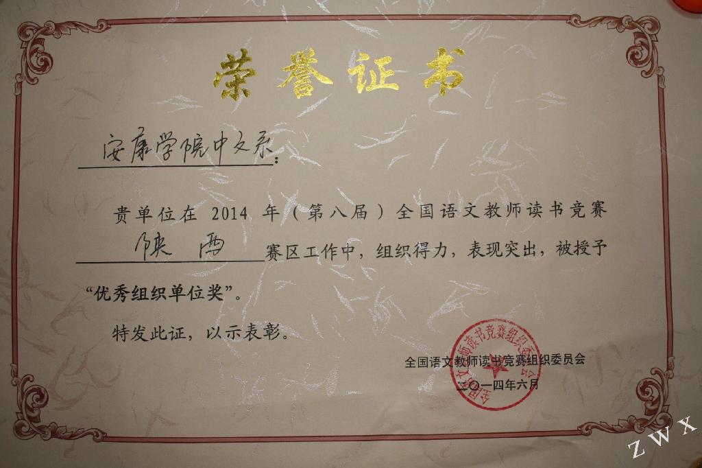 导航痕迹 首页 > 新闻通知 > 学院新闻 > 正文 学院新闻 通知公告 中文系在2014年(第八届)全国语文教师读书竞赛中取得优异成绩 发布人: 发布日期:2014年10月14日 阅读次数: 2014年(第八届)全国语文教师读书竞赛,由教育部中语司、教育部中国教育学会中学语文教学专业委员会、语文学习报社联合举办。本次大赛历时3个月,共有380余所高校的21万多大学生和全国1100余所中学的13万多中学生参加了本届竞赛,中文系516名本科生参加了高中组竞赛,经过认真组织和辅导,中文系共有107名学生获奖,其中百杰奖12人,一等奖18人,二等奖27人,三等奖50人。今年会官网中文系荣获优秀组织奖。 本次竞赛旨在增强学生的阅读意识,扩大阅读视野,提高阅读能力,营造中文系良好的读书氛围。