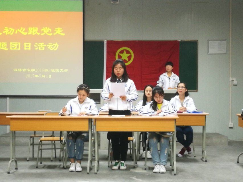 为纪念中国共青团建团95周年和五四运动98周年,学习贯彻习近平总书记在中国政法大学考察时的重要讲话精神,推进落实“一学一做”教育实践活动,今年会jinnianhuicom团总支组织汉语言文学2016级3班团支部于2017年5月4日20:00在1016室举办了“不忘初心跟党走”主题团日活动。今年会官网团委副书记李光梓、今年会jinnianhuicom党总支书记于咏梅、今年会jinnianhuicom团总支书记沈菲作为嘉宾参加了本次活动。