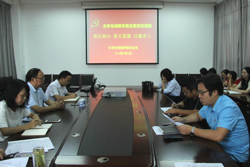 为落实习近平总书记“把全面从严治党落实到每个支部、每名党员”及“要深刻剖析反面典型,以案例明法纪、促整改,发挥警示作用”的要求,巩固第二个纪律教育学习宣传月学习成果,文传学院党总支于9月4日下午开展了主题为“铭记初心·崇文重德·以廉育人”的主题党日活动。文传学院全体教师和部分学生党员参加主题党日活动。