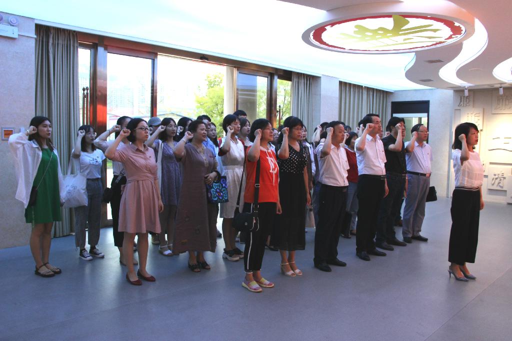 参观学习结束后,师生党员在基地主体大厅面对党旗,重温入党誓词。在文传学院党总支书记于咏梅同志领誓下,王国良同志和文传学院师生一起举起右拳,庄严宣誓。