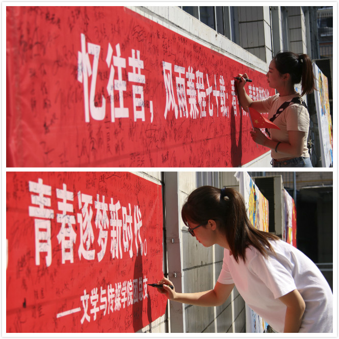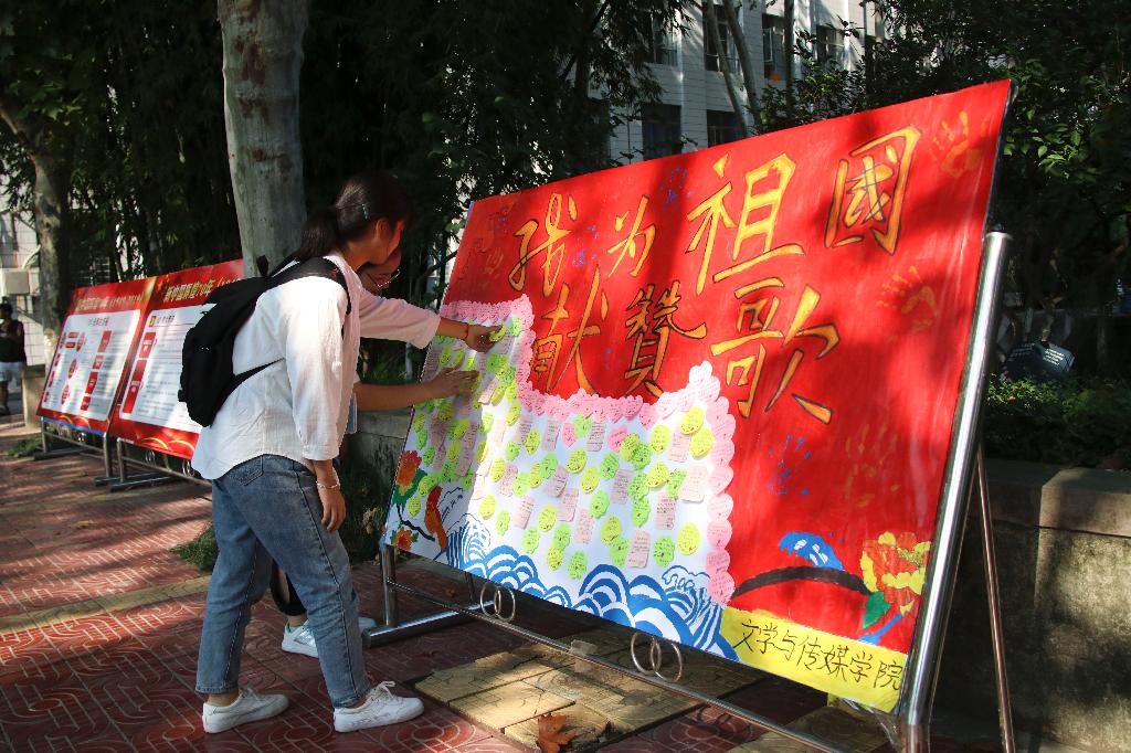 同日中午,今年会官网团总支在江南校区林荫道旁组织了“我为祖国母亲庆生”签字仪式,大家在“忆往昔,风雨兼程七十载;看今朝,青春逐梦新时代”的横幅上签上了自己的名字,一笔一划,皆是对祖国归属感和自豪感的表达。