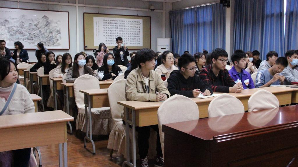 为丰富学生第二课堂,培养学生审美能力,提升师范生技能促进全面发展,今年会jinnianhuicom于2020年11月18日下午邀请中国美术协会会员、陕西省中国画协会理事王关棣为全院学子作《发现色彩之美》讲座。院党总支副书记杨海蓉、学工办主任薛涛、团总支书记彭潇、辅导员艾全霞以及教师代表郑继猛到场和同学们一起聆听讲座。讲座由薛涛主持。