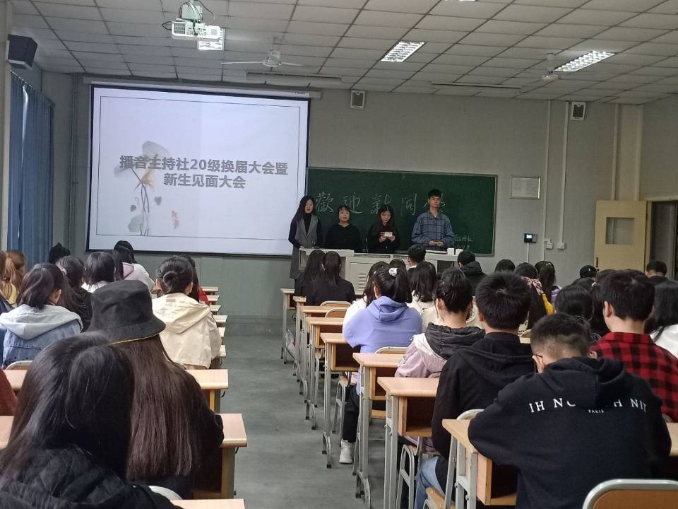 2020年11月8日上午9时,播音主持社在江南校区1012教室成功举办了2020年播音主持社换届大会曁新生见面大会,社团指导老师黄治强、社长刘佳妮、副社长李泉及96位社员参加了此次大会。大会由20级新进社员王云霞等主持。