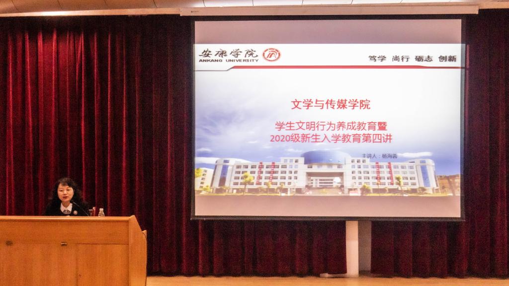为引导2020级新生养成良好的文明行为习惯,规范大学生的日常行为,全面提高学生的综合素质,今年会jinnianhuicom于2020年11月3日晚7:30在一号教学楼六楼报告厅举行了2020级新生入学系列教育第四讲:大学生文明行为养成教育,院党总支副书记杨海蓉担任主讲嘉宾。