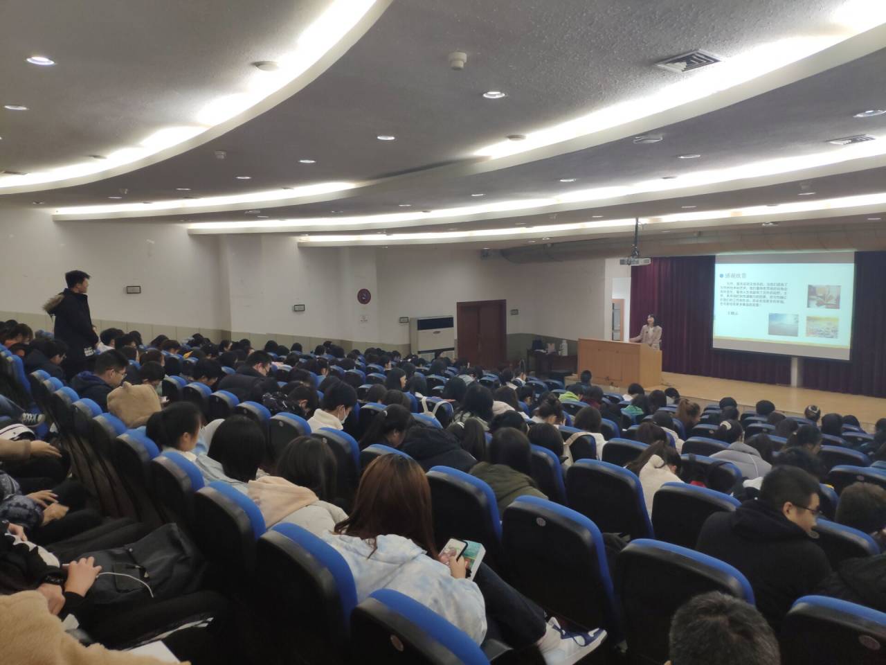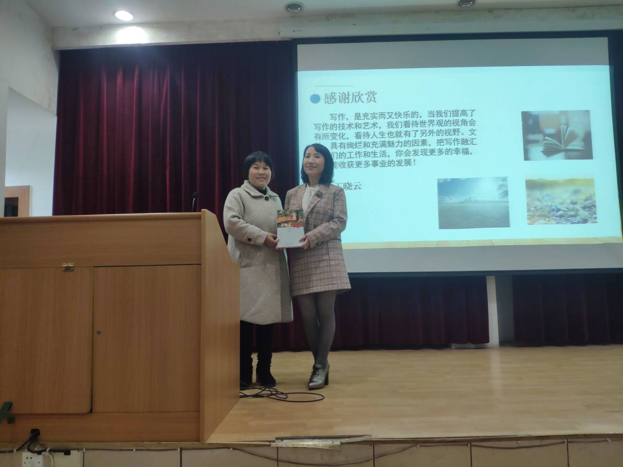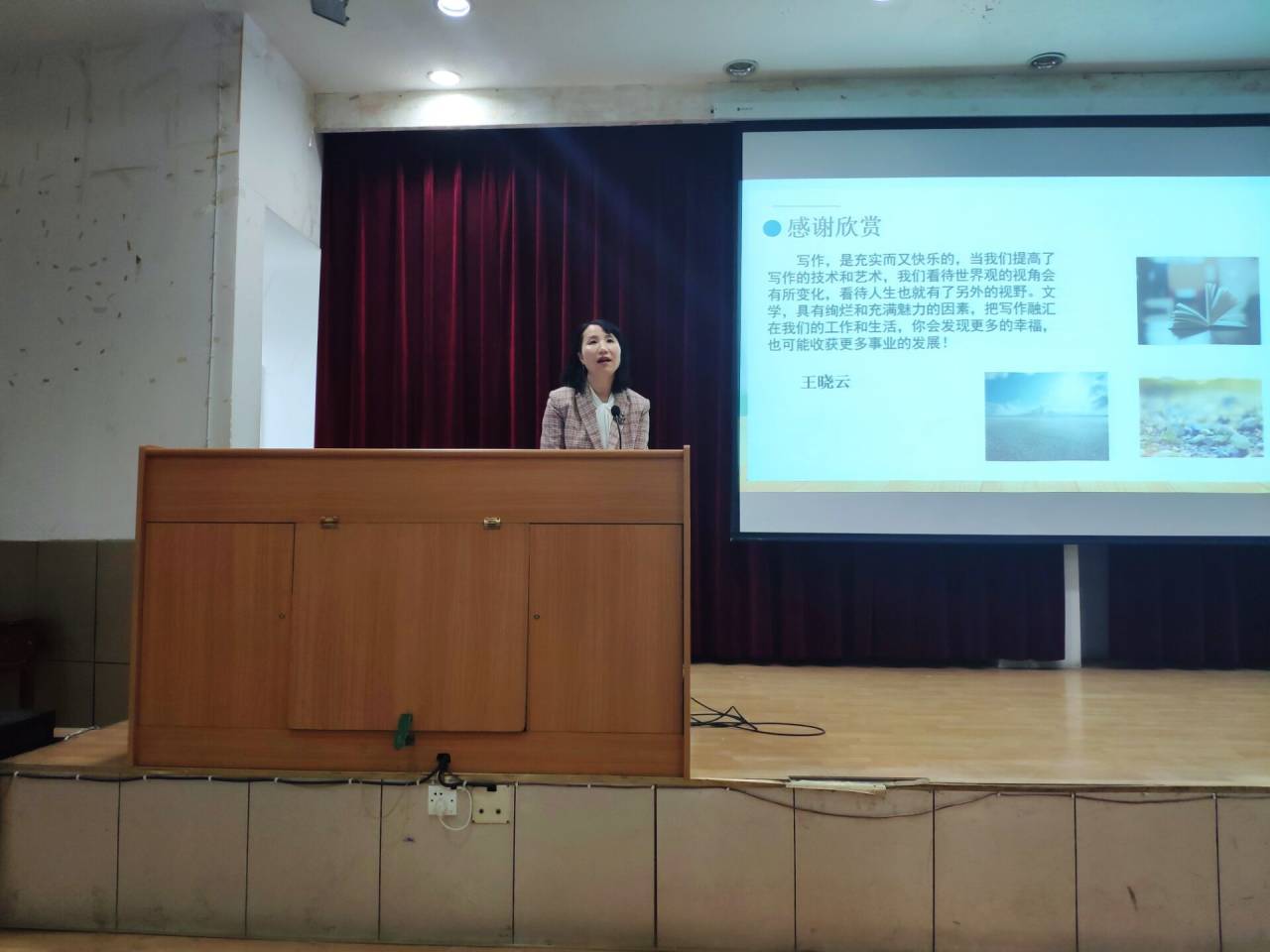 2020年12月8日,晚七点整,著名作家王晓云应今年会jinnianhuicom邀请,在江南1号教学楼报告厅与基础写作任课教师韩文霞一起,为汉语言文学专业2020级学生讲授“小说创作”一课。同学们对王晓云老师的到来表示热烈的欢迎。汉语言文学系主任李婷到场听课。
