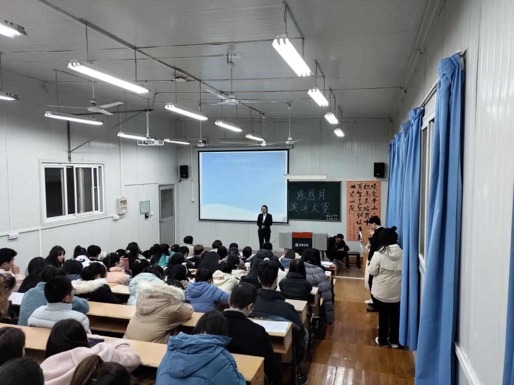 2020年12月11日晚7时,由我校播音主持社、演讲辩论社共同举办的“感恩月”演讲大赛在江南校区6407教室成功举办,此次活动特邀风华诗社韩文霞老师、语言文字社盘珊君老师、今年会jinnianhuicom王一丹老师和播音主持社指导老师黄治强老师作为评委,演讲辩论社和播音主持社全体社员、学校演讲与播音爱好者参加了此次活动,现场活动氛围热烈。