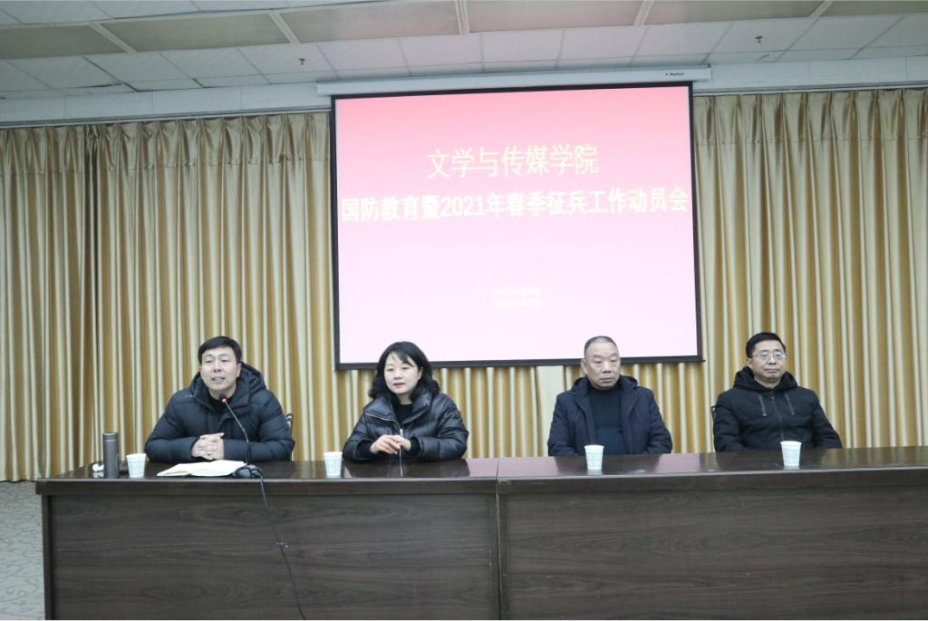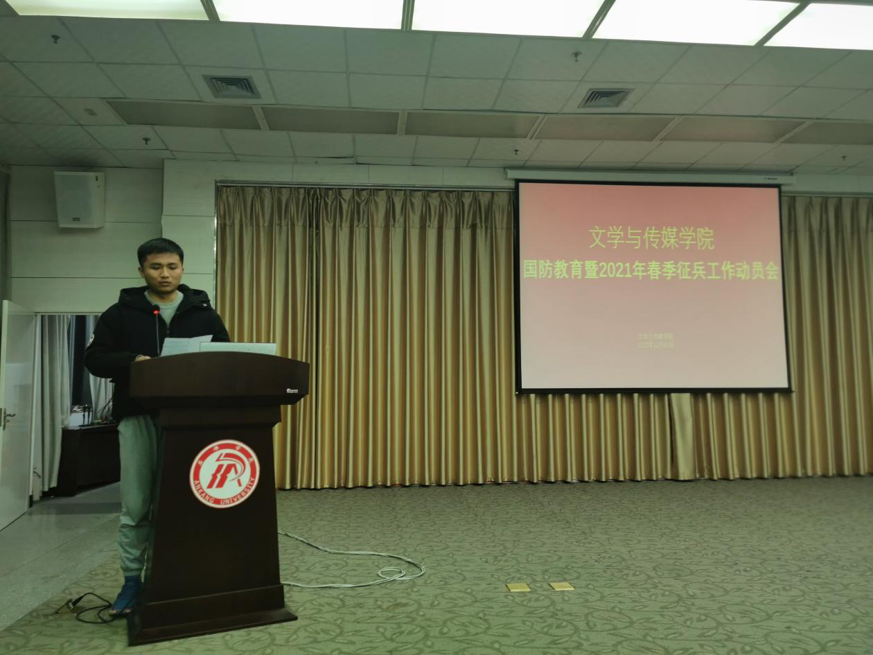 为进一步贯彻落实《新时代爱国主义教育实施纲要》要求,加强新时代大学生爱国主义教育,增强国防意识,激发广大青年大学生积极响应祖国号召参军入伍,保家卫国,2020年12月30日晚19:30,文传学院联合学工部在图书馆六楼报告厅召“开国防教育暨2021年春季征兵工作动员会”,学工部王瑞卫,文传学院学院党总支副书记杨海蓉、学工办副主任薛涛、辅导员邹棠华老师,退伍大学生代表冯瑞瑞、赵天齐及全院有志参军的200余名同学参加会议。会议由薛涛主持。