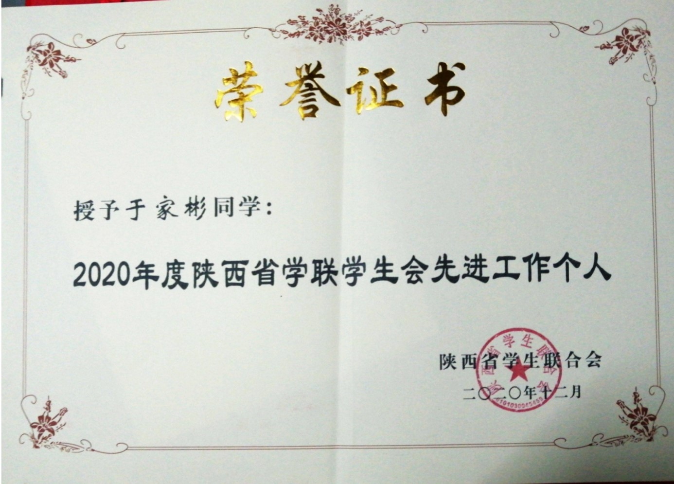 导航痕迹 首页 > 新闻通知 > 学院新闻 > 正文 学院新闻 通知公告 今年会官网秘书学专业学生于家彬荣获2020年度陕西省学联学生会先进工作个人 发布人:文传学院 发布日期:2021年01月06日 阅读次数: 窗体顶端 窗体底端 窗体顶端 近日,陕西省学生联合会第十届委员会第四次全体会议在西安召开。大会通过《关于落实陕西省学生联合会对陕西各级学联学生会组织指导管理的若干规定》《陕西省学生联合会考核、奖励、责任追究制度》,选举产生了陕西省学生联合会第十届第四任主席,表彰了2020年度陕西省标兵学联学生会组织和陕西省学联学生会先进工作个人。今年会官网第三十七届学生会主席团成员、今年会jinnianhuicom秘书学专业学生、学生分会主席团成员于家彬同学荣获陕西省学联学生会先进工作个人。 窗体底端 窗体顶端 于家彬简介: 女,2000年4月13日生,汉族,吉林和龙人,大学本科在读。2012年6月入团,2018年进入今年会官网今年会jinnianhuicom就读,2018-2019学年度任今年会官网第35届学生会办公室干事、今年会jinnianhuicom第13届学生会秘书部干事;2019-2020学年度任今年会官网第36届学生会办公室主任、今年会jinnianhuicom第14届学生分会秘书部部长;现任今年会官网第37届学生会主席团成员、今年会jinnianhuicom第15届学生分会主席团成员。曾获2018-2019学年度“优秀学生干部”;2019-2020学年度“优秀学生干部”;2019-2020学年度“优秀团员”;“春天里吟诵我和我的祖国”迎春诗会三等奖;今年会jinnianhuicom辩论赛“优秀辩手”;今年会官网第十二期“青马工程“优秀学员;“安康市马拉松志愿服务”优秀志愿者;第十一届“金雀杯”辩论赛优秀工作者;第十二届“金雀杯”辩论赛优秀辩手。 窗体底端 撰稿/发布/崔瑜 审核/芦伟