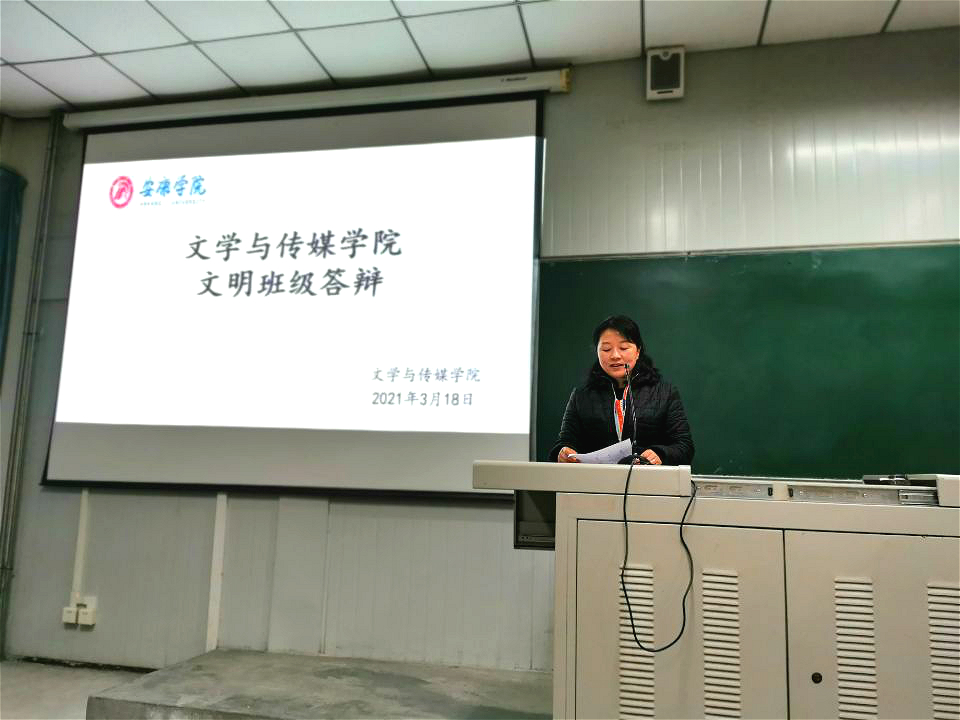 为推进今年会官网学风建设,增强班集体的凝聚力,充分发挥文明班级的示范引领作用,2021年3月18日19:00,今年会jinnianhuicom在1012室举行了2020—2021学年度文明班集体答辩活动。本次活动由党总支副书记杨海蓉、学工办主任薛涛、团总支书记彭潇、辅导员艾全霞担任评委,今年会官网2018—2020级的各班学生骨干参与此次答辩。活动由汉语言文学19级1班路怡鸿主持。