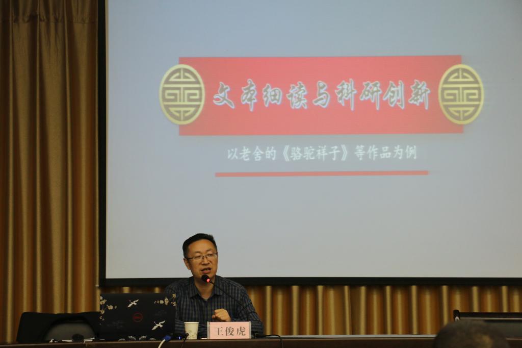 王俊虎教授首先阐述了文本细读的含义,然后以老舍《骆驼祥子》中祥子的婚恋观和曹禺《雷雨》中的若干情节解读为例,详细阐述了文本细读的方法以及其与科研创新的关系。整场报告语言风趣幽默、逻辑清晰、引人入胜,使在场学生受益匪浅,现场气氛活跃,掌声不断。