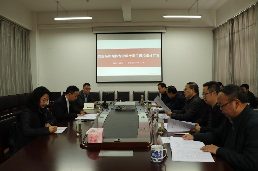 文传学院院长杨运庚代表学院就网络与新媒体专业的专业特色、师资力量、办学条件、教学运行和管理、科研成果、学生成果等进行了详细汇报。与会专家听取汇报后,认真审阅了申报材料,走访了实训室,并分两个小组与教师代表和学生代表开展座谈。座谈会后,专家组成员对申报材料、走访座谈情况进行了反馈,并对网络与新媒体专业的下一步建设提出了中肯的建议。最后,专家组投票表决,一致认为网络与新媒体专业已经具备授予学士学位的基本条件,同意增列为学士学位授权专业。