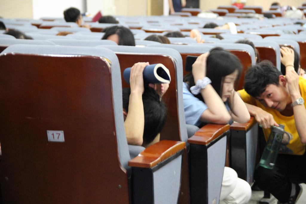 接下来,组织开展了防灾减灾疏散演练。当第一次警报响起时,现场同学迅速弯腰下蹲并用书包、双手等护住头部;当第二次警报响起时,全体同学有序撤离大礼堂。整个行动同学们严肃冷静、有条不紊,最终全体师生安全撤离。