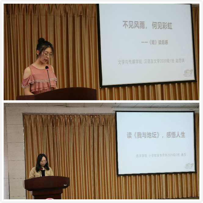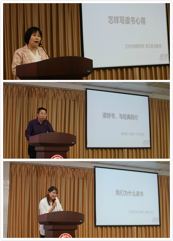韩文霞、段昌华、杨丽三位老师为我们进行了现场的读书心得指导。文霞老师做了《怎样写读书心得》发言,她提到了我们现在读书存在一个重要问题——量少面窄,提倡我们在大学期间应该多读书。然后从“要读什么书”“怎么读书”“怎么写作”三方面向同学们阐述了怎样写读书心得。接下来段昌华老师做了《读好书,与经典同行》的报告,告诉了我们“何为经典、为什么要读经典、读哪些经典、在经典中推广经典著作”并总结了本次活动情况。马克思主义学院的杨丽老师向同学们谈论了《我们为什么要读书》,“读书可以减少迷茫、认识自己、增强四个自信、对人生发展进行指导”,呼吁同学们多读书
