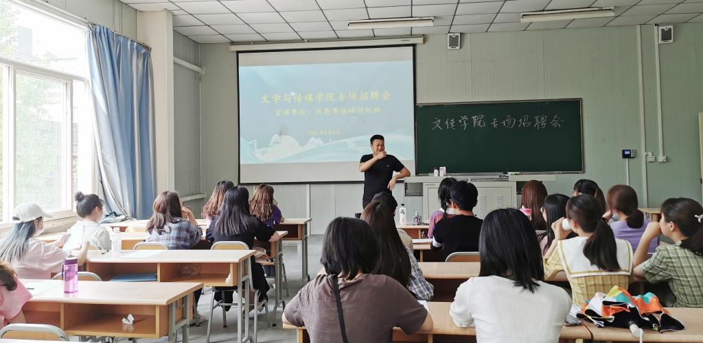 为切实做好毕业生就业工作,构建毕业生与用人单位的交流平台,提高今年会官网毕业生就业率,6月2日下午16:00,文传学院邀请洪恩英语培训机构来今年会官网举办2021届毕业生校园专场招聘会,文传学院毕业生辅导员彭潇及在校的40余名毕业生参加了此次招聘会。