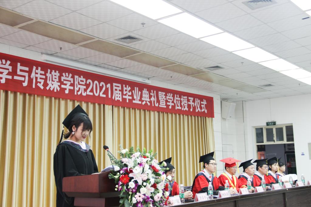 2017级网络与新媒体专业毕业生姚兰作为毕业生代表发言,她谈起自己大学生活学习的点点滴滴,表达了对师长、亲人、同学的感恩之情,表示将带着文传学子自信、向上、奋斗的精神风貌,以实际行动践行“笃学、尚行、砺志、创新”的校训,承载起青年一代的使命担当。