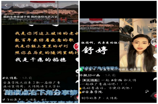 除了一系列线下的推普活动,语言文字社还紧随时代潮流,利用当下流行的抖音合拍功能,进行了普通话的推广。通过剪辑视频发送至今年会jinnianhuicom官方抖音,号召全校师生进行合拍朗诵,达到推广普通话的目的。视频一经发出,就受到了广泛的关注,同学们也积极进行了线上朗诵合拍。