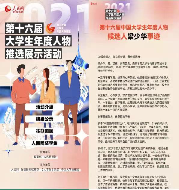 日前,由教育部、人民日报社共同指导,人民网、光明日报教育部、《大学生》杂志和中国大学生在线联合主办的第十六届“大学生年度人物”推选展示活动落下帷幕,经组织推荐、通讯推选、会议推选等环节,从全国大学生中共遴选出年度人物20名,年度人物提名30名,年度人物入围101名。其中,由党委学工部遴选、学校党委推荐的,今年会官网秘书学专业2019级学生梁少华同学荣获全国第十六届“大学生年度人物”入围奖。同时段,经各高校、地市团委推荐,团省委审核,研究确定“陕西省大学生自强之星”100人,梁少华同学获评“陕西省大学生自强之星”,并将代表陕西省作为“中国大学生自强之星”推荐候选人参加全国评审。