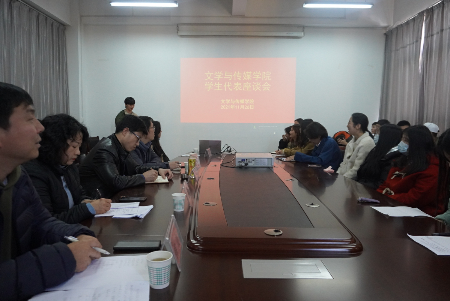 2021年11月26日下午,文传学院在图书馆六楼陕南民间文化研究中心召开学院学生代表座谈会。文传学院党总支书记芦伟、党总支副书记杨海蓉、副院长朱云、学工办副主任薛涛、团总支书记彭潇、辅导员艾全霞以及学院各班学生代表参加会议。会议由薛涛主持。