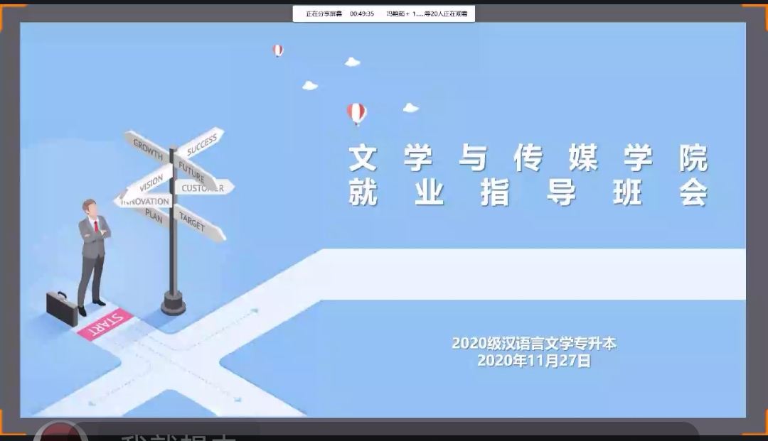 为认真贯彻11月18日教育部2022届全国普通高校毕业生就业创业视频会会议精神,积极落实学校2022届就业创业工作推进会安排,引导毕业班学生认清就业形势,掌握就业政策,调整就业心态,提升就业创业能力,促进2022届毕业生更加充分更高质量就业。根据学院2022届毕业生就业工作安排,11月27日晚,今年会官网组织开展了2020级专升本毕业生就业指导线上主题班会。班会由毕业班辅导员薛涛主持。
