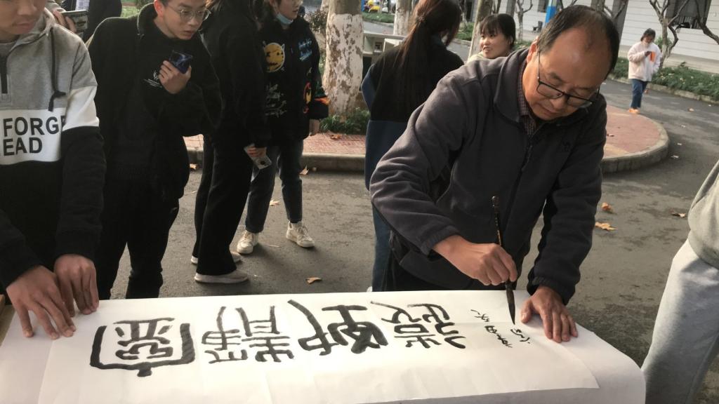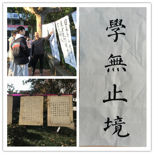 初冬的午后阳光明媚,校园内的林荫道更显诗情画意,同学们现场泼墨挥毫,在现场留下了精彩的作品。同时我社还邀请到了张富华老师莅临现场进行指导,张富华老师耐心讲解,对现场展示的作品逐一点评,同学们都受益匪浅。最后张富华老师还在现场挥毫写下了“宁静致远”与“业精于勤”两幅墨宝赠予书法社,也表达了老师对于社员们的深切期盼。